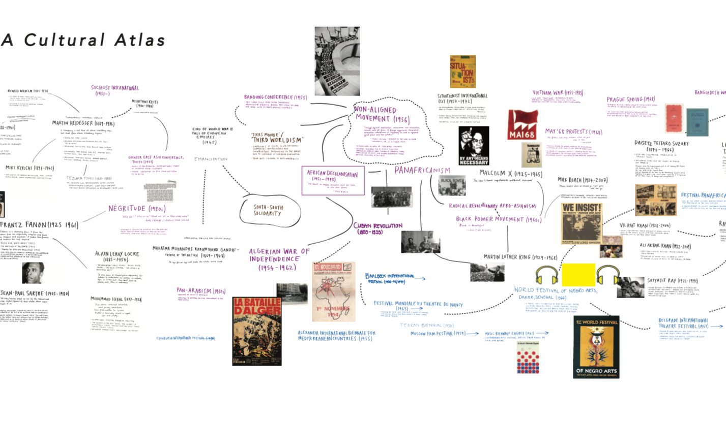 The interactive and ongoing Cultural Atlas conjures a fragmented history of the long twentieth century through the ambitions and contradictions of countless utopian universalist episodes and ideals: transcendental internationalisms; radical liberations; emancipating solidarities.